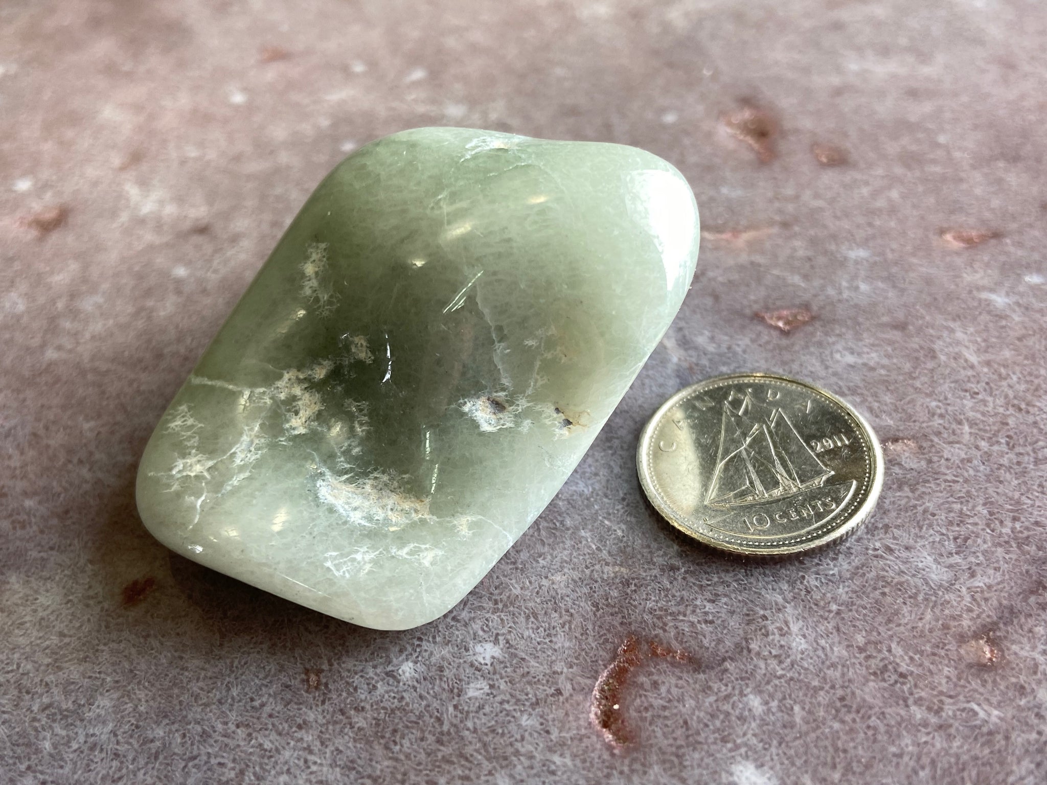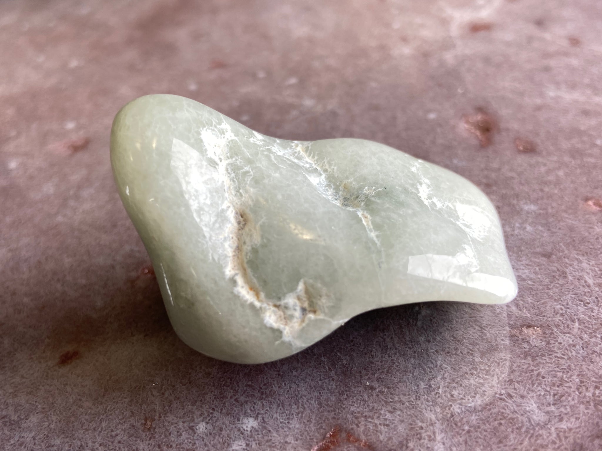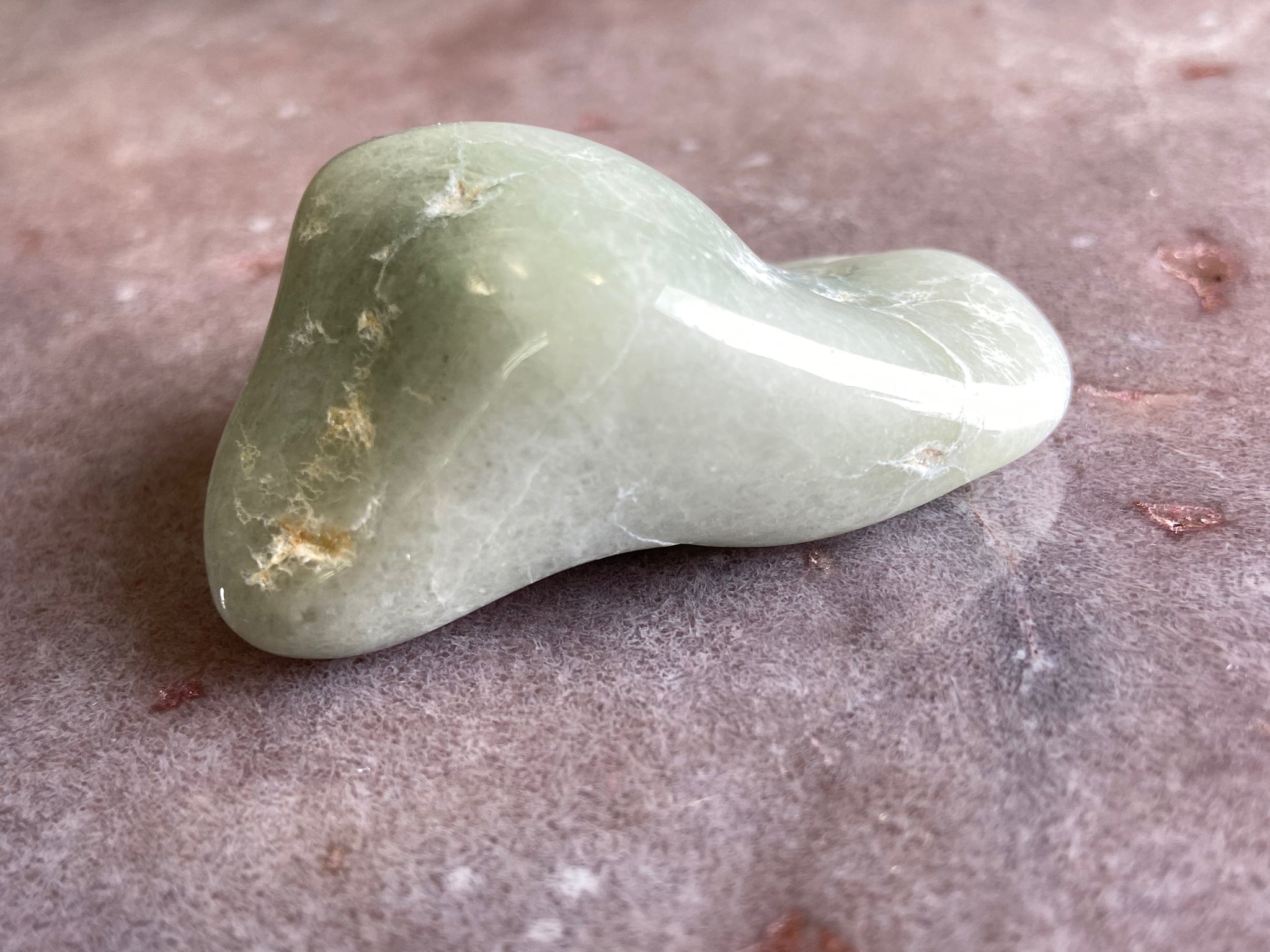 This white and orange Jadeite comes from Guatemala and was found in ancient scrap heaps from where the ancient Mayans would chip it off to extract the blue green jade for tools and adornment.  The pale white glows under the moon giving it the name Lunar.