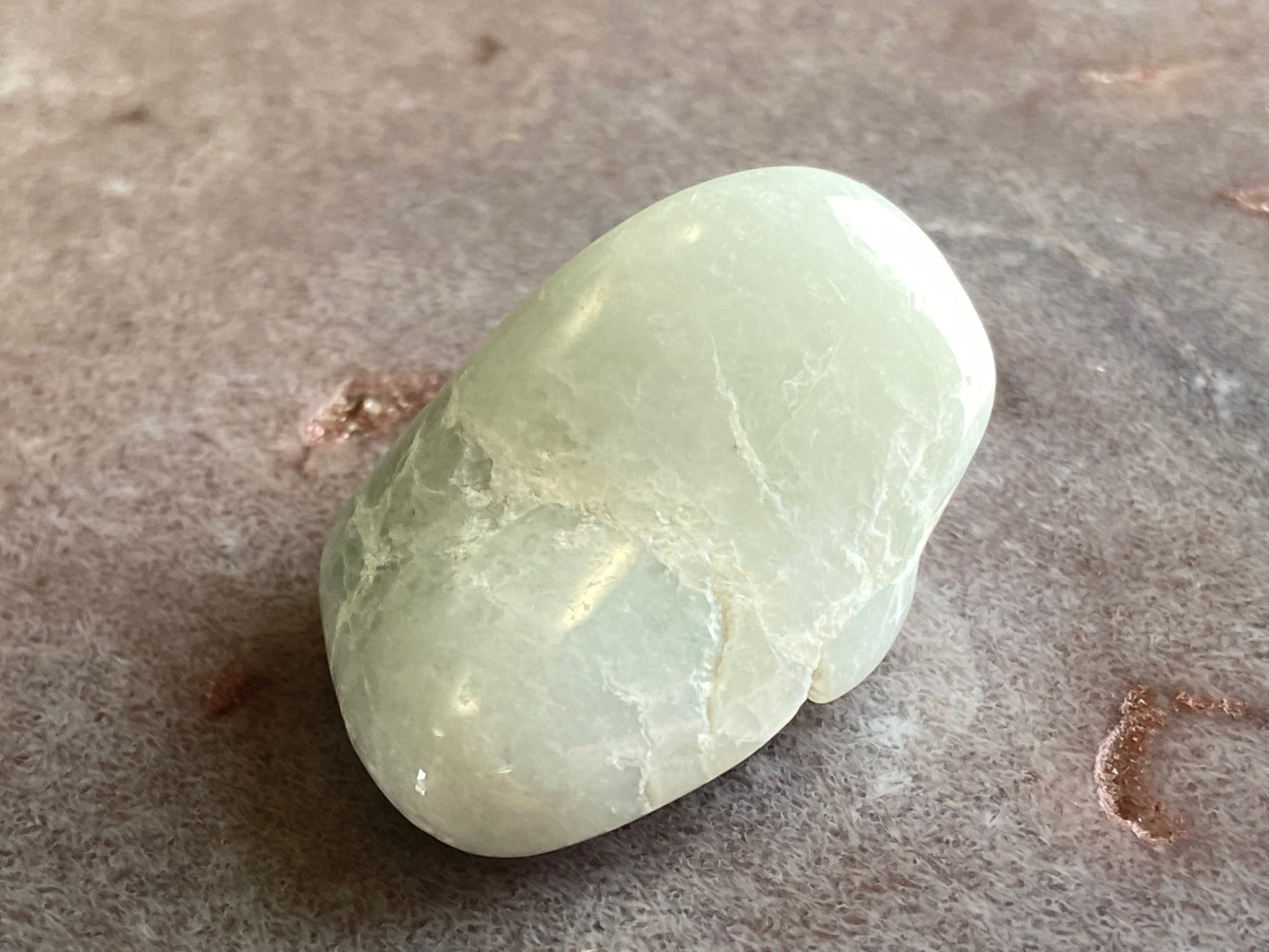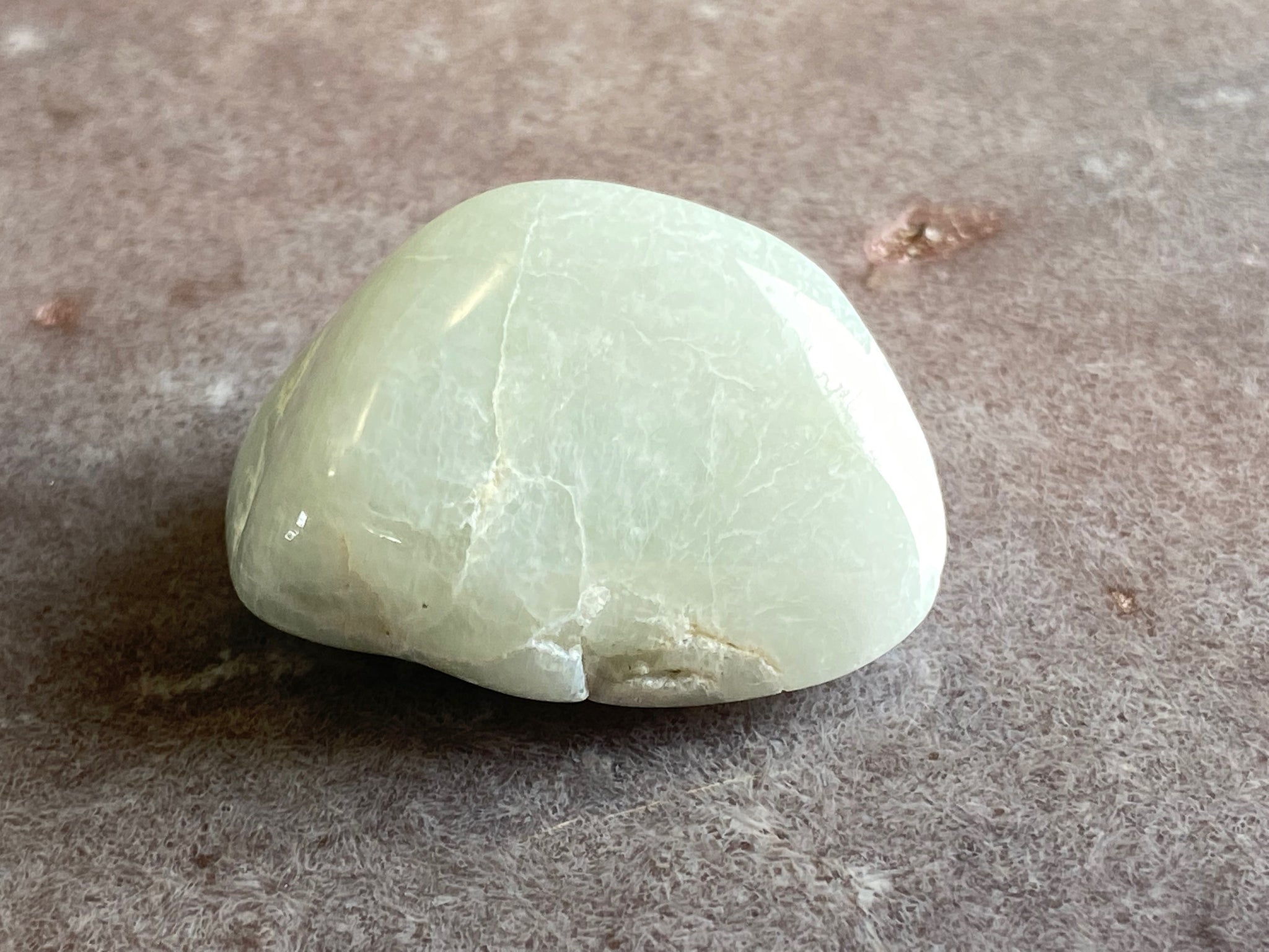This white and orange Jadeite comes from Guatemala and was found in ancient scrap heaps from where the ancient Mayans would chip it off to extract the blue green jade for tools and adornment. The pale white glows under the moon giving it the name Lunar.