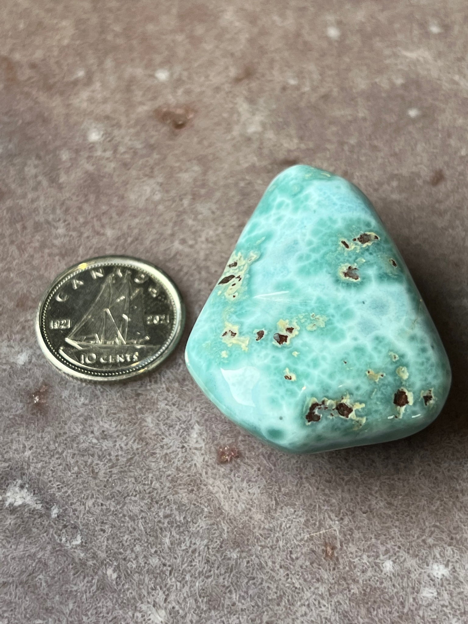 Larimar is also called the dolphin stone and is thought to embody the elements of water and fire. It is known to open the throat chakra and connect to the solar plexus and heart supporting peaceful communication and expression of boundaries and emotions. It is very calming and can encourage the development of emotional intelligence.